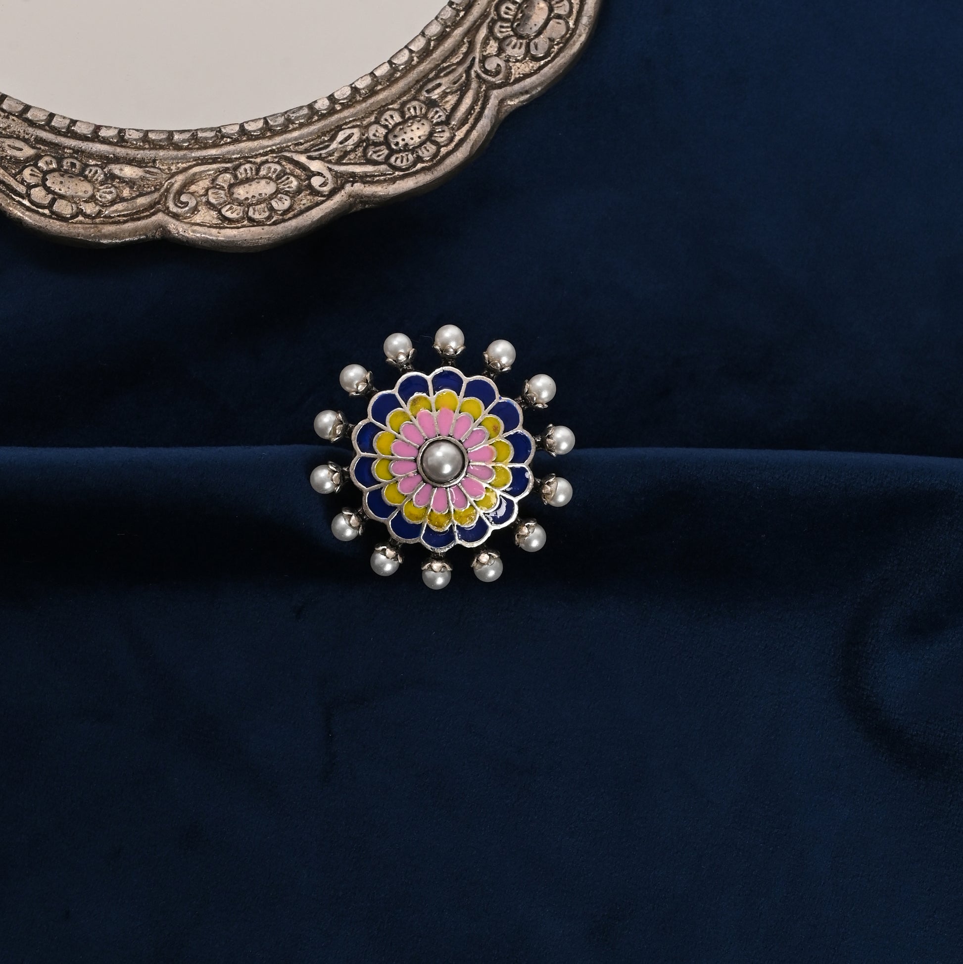 Expertly crafted from brass, this statement ring features intricate meenakari work and a delicate pearl accent, showcasing timeless elegance. Its hypoallergenic design ensures comfort for sensitive skin, while the adjustable size provides a perfect fit for both women and girls. A refined accessory that blends traditional craftsmanship with modern versatility.