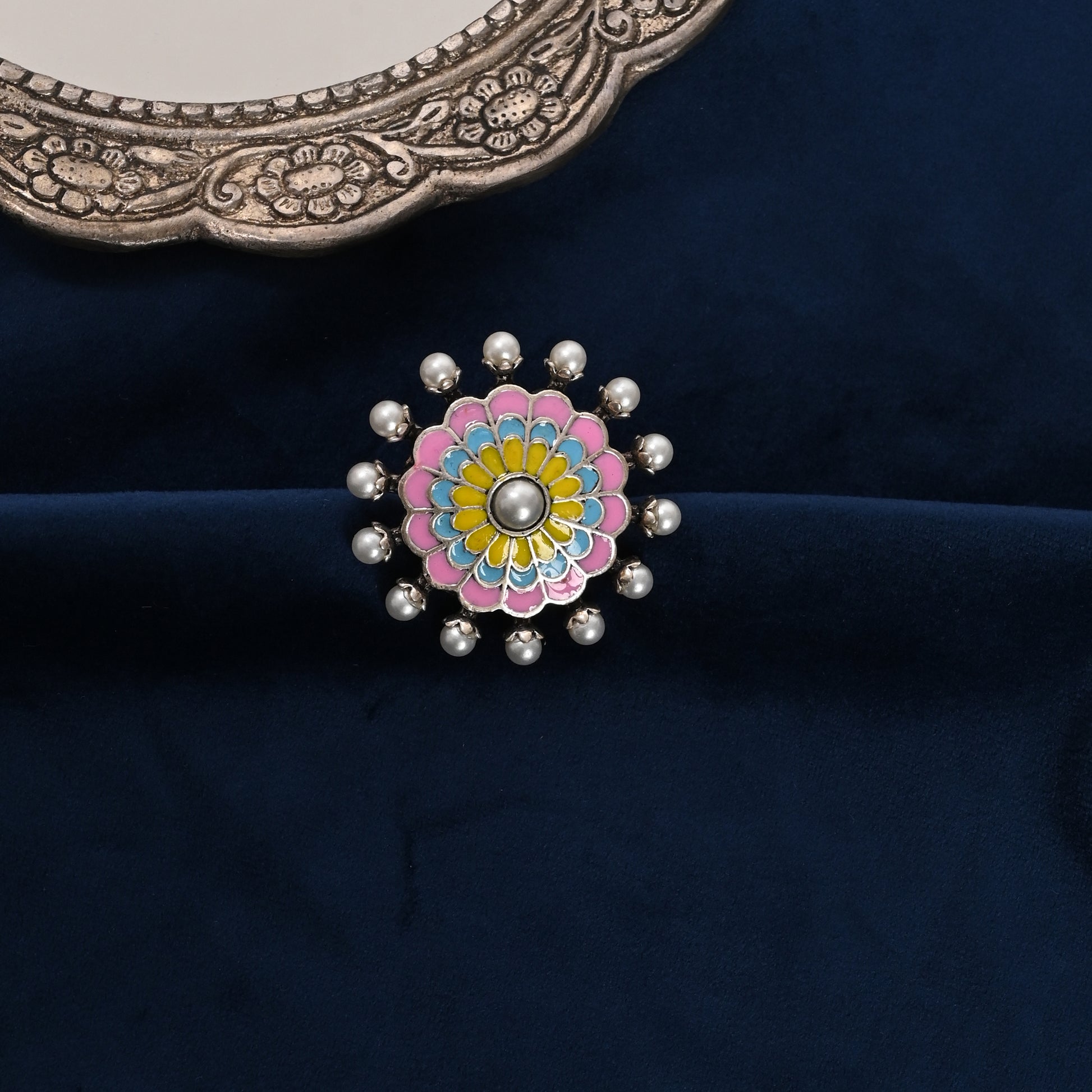 Meticulously fashioned from brass, this statement ring highlights detailed meenakari artistry paired with a subtle pearl embellishment, embodying classic sophistication. Designed to be hypoallergenic, it offers comfort for sensitive skin, and its adjustable band guarantees an ideal fit for women and girls alike. This elegant piece seamlessly combines heritage craftsmanship with contemporary adaptability..