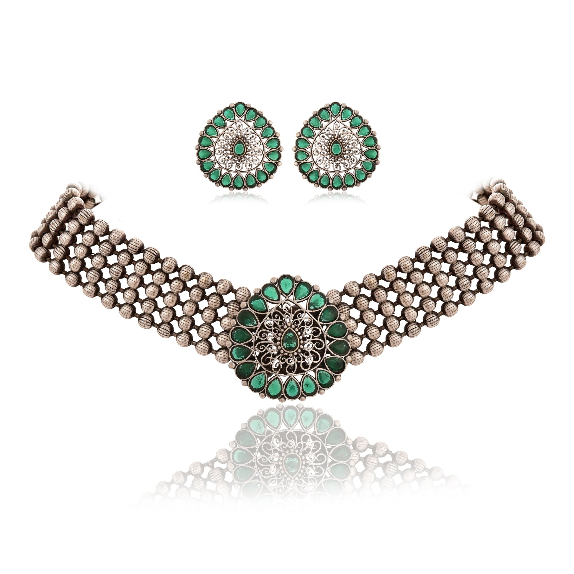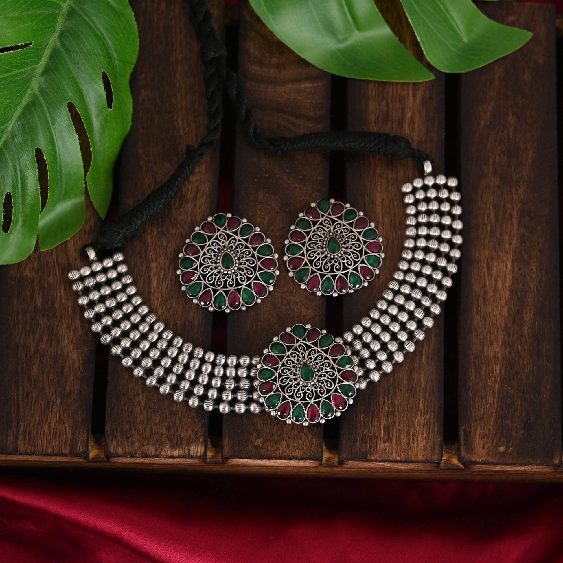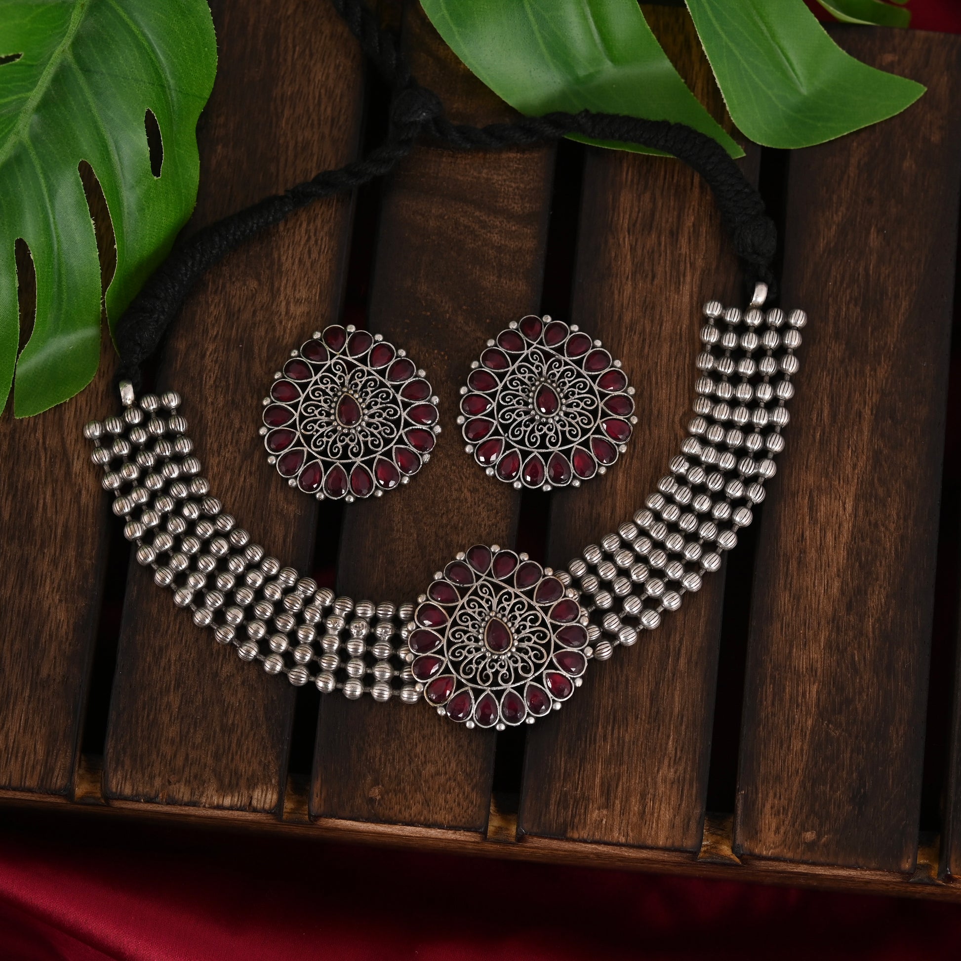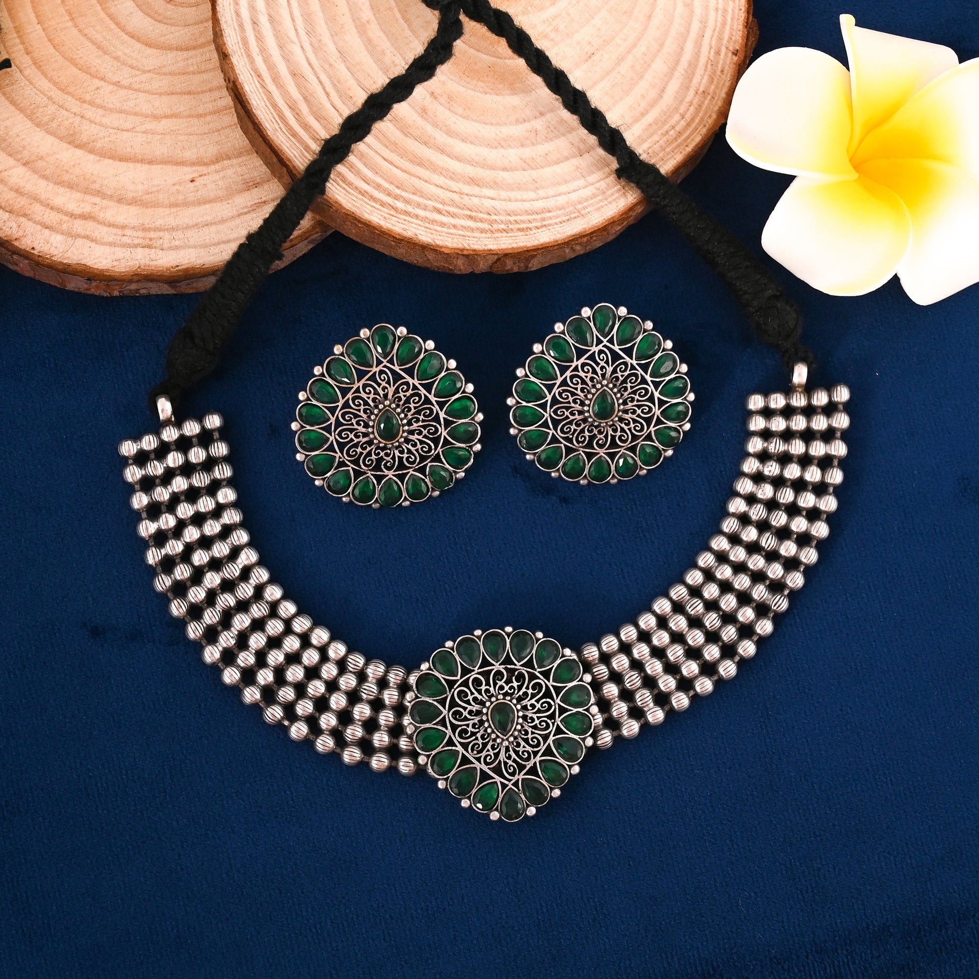 Beautiful Drop Shape Choker Jewel Set With Adjustable Drawstring . Matte Finishing & Dull Polish With Black Silver look. Experience elegance and versatility with this drop shape choker jewel set. It features an adjustable drawstring for a perfect fit and is coated with a matte finishing and dull polish for a sleek black silver look.
