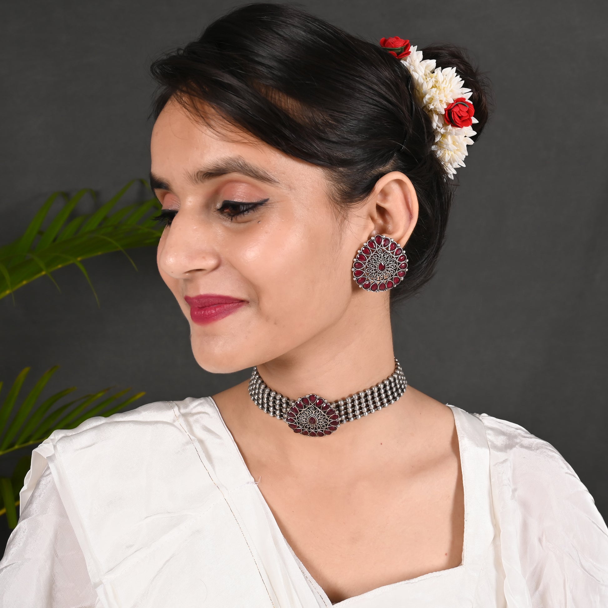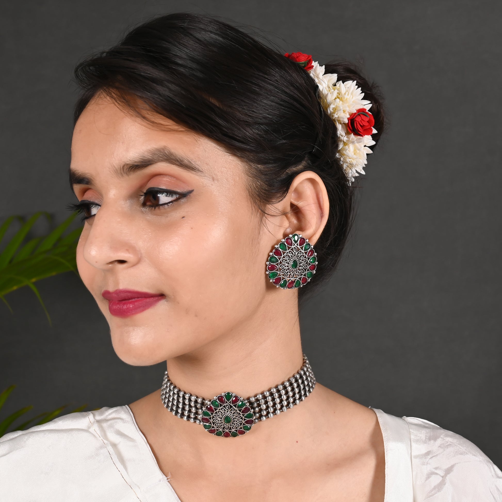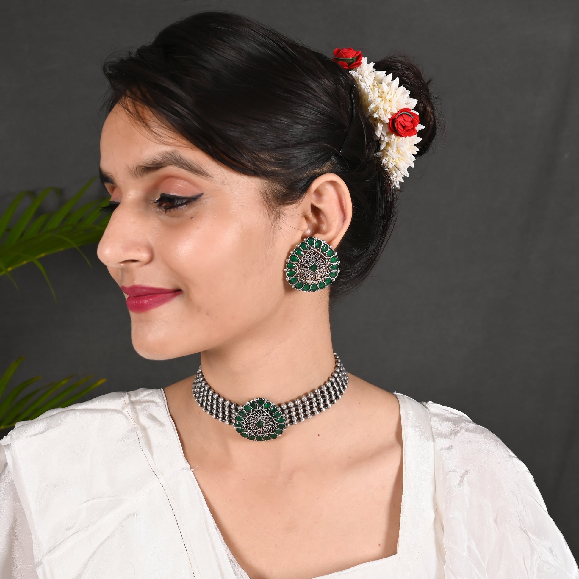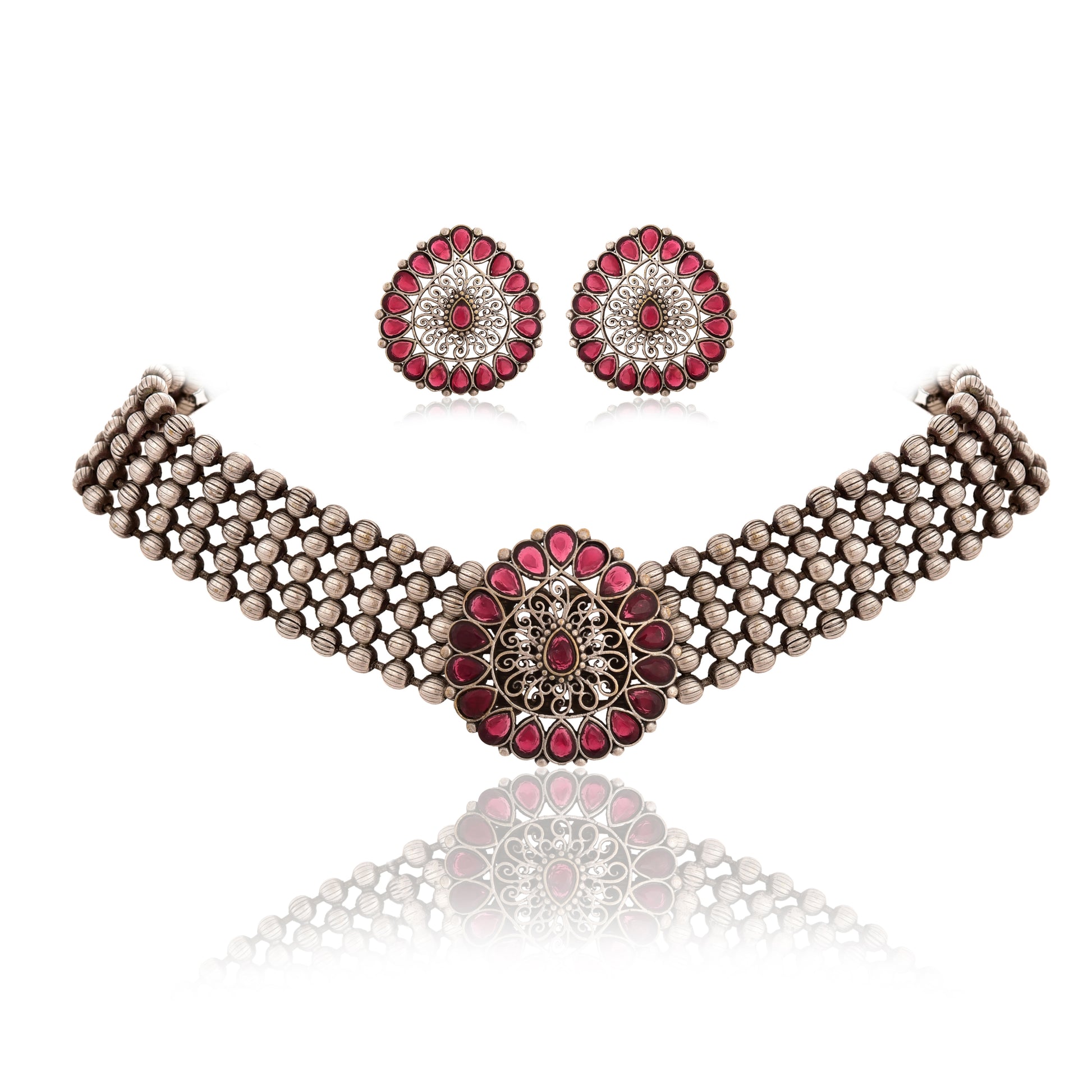 Beautiful Drop Shape Choker Jewel Set With Adjustable Drawstring . Matte Finishing & Dull Polish With Black Silver look. Experience elegance and versatility with this drop shape choker jewel set. It features an adjustable drawstring for a perfect fit and is coated with a matte finishing and dull polish for a sleek black silver look.