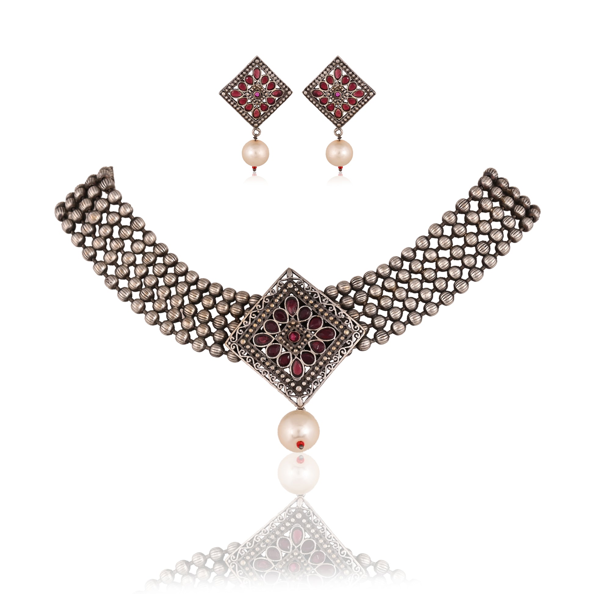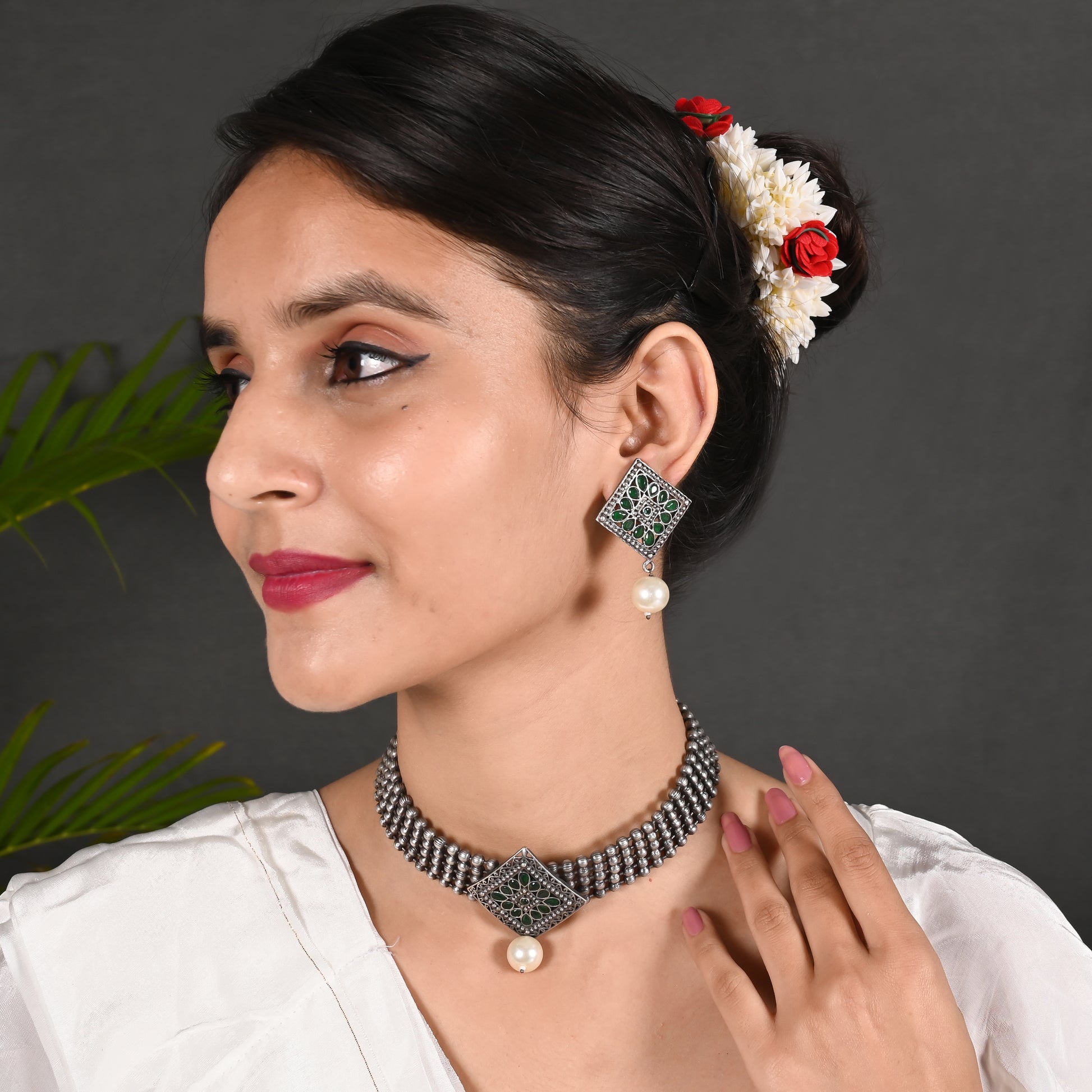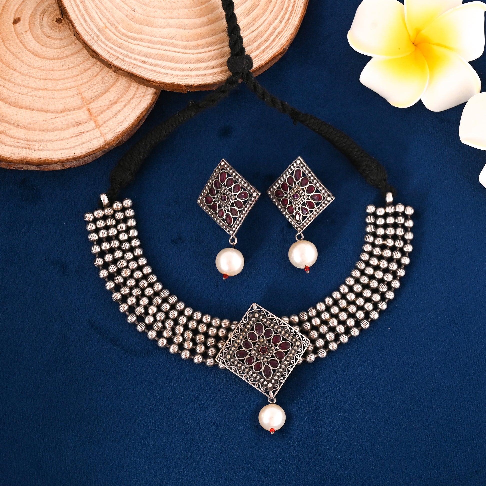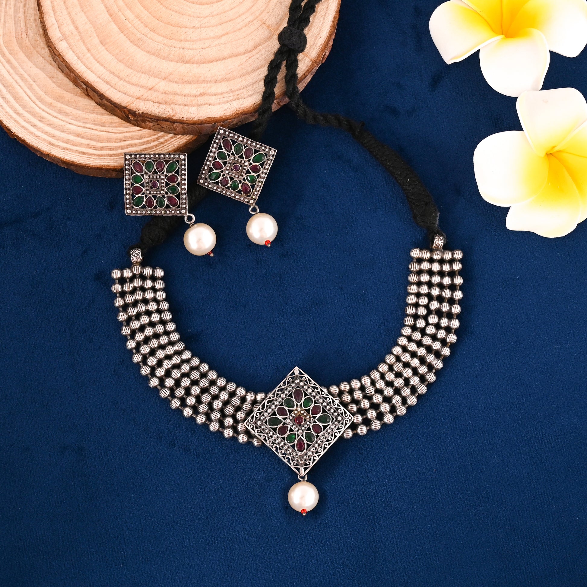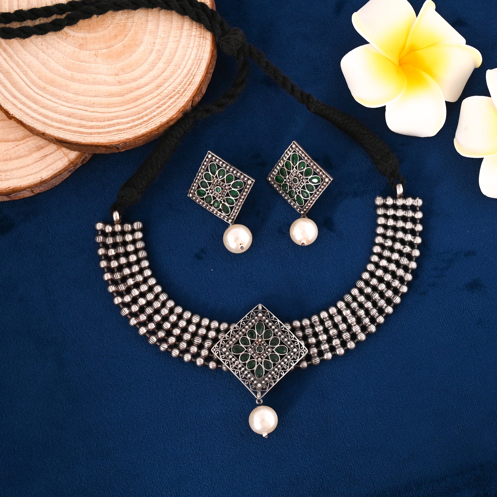 Since 2022, TANUSHA JEWELS Prevail to Provide Good Quality Products to customers , We Constantly Think About our Customer And Their Preferences to Design the Jewellery Piece That Carry Out the Finest Us . We Assure The Top Quality Experience In Making Our Jewels 99.9% Skin Friendly . ETHNIC CHOKER NECKLACE Jewellery Set . Best When Paired With Indian Or Indo Western Attire . Dull Black Silver Polish Makes It More Beautiful And Antique. Whether You are Attending a Party or Hosting An Event , This Ethnic Jewellery Piece From TANUSHA JEWELS Is Something you Need To Take Your Look in Next Level .