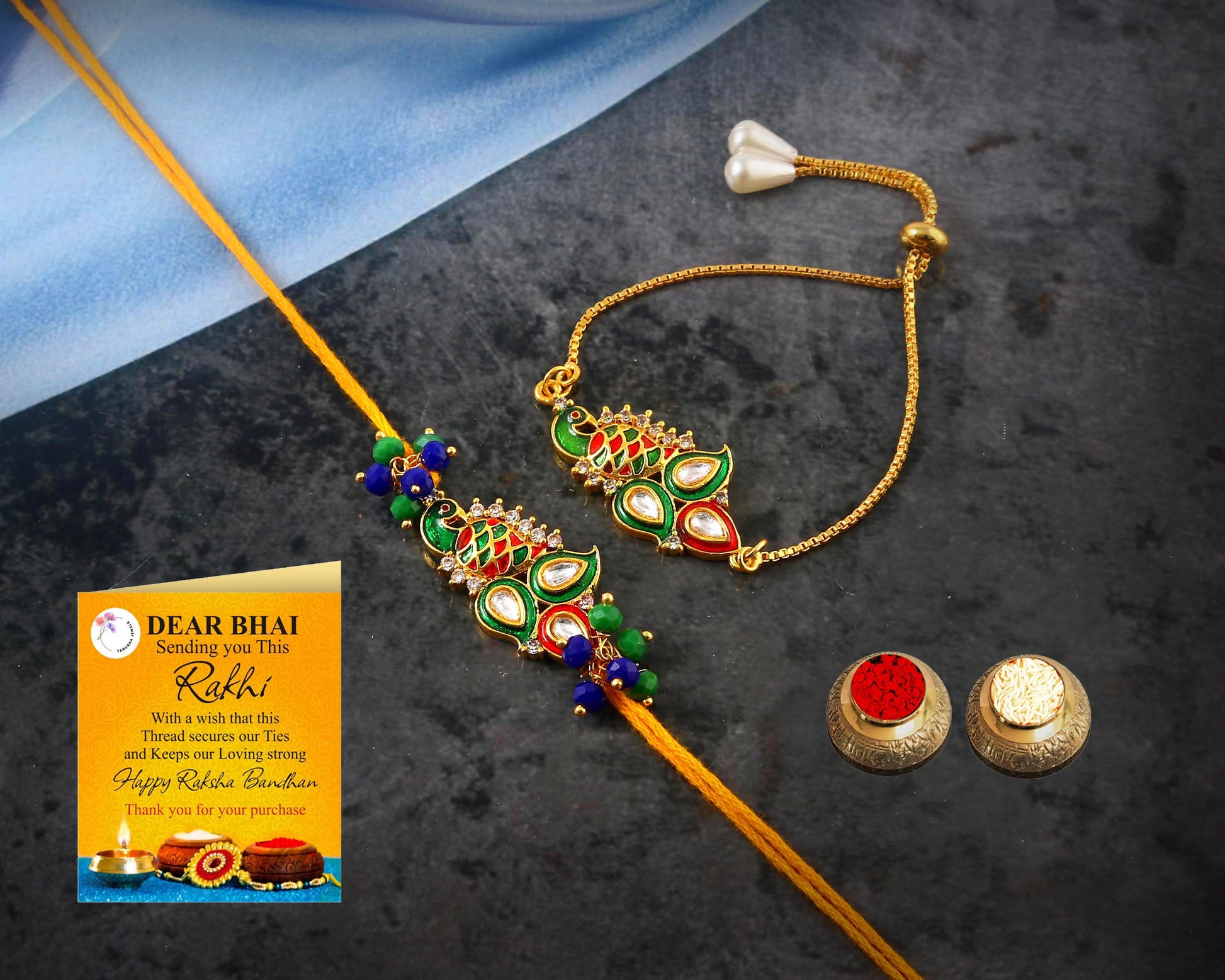 Enhance your Raksha Bandhan celebration with the exquisite Tanusha Jewels Designer Rakhi Set. This set comes with 1 pack of roli chawal and 1 greeting card, making it an ideal expression of love and appreciation. Strengthen the bond between brother and sister-in-law with this premium quality Rakhi set. Elevate your Raksha Bandhan festivities with the elegant Tanusha Jewels Designer Rakhi Set. Included in this set is 1 pack of roli chawal and 1 greeting card, making it a perfect way to show your affection and gratitude. Strengthen the special bond between a brother and sister-in-law with this high-grade Rakhi set. Experience the ultimate Raksha Bandhan celebration with the luxurious Tanusha Jewels Designer Rakhi Set. With 1 pack of roli chawal and 1 greeting card included, it serves as the perfect symbol of love and gratitude. Elevate your Raksha Bandhan festivities by showcasing your appreciation for the special bond between a brother and sister-in-law with this premium Rakhi set. Designed with high-quality materials, this set is sure to strengthen your relationship and create lasting memories.