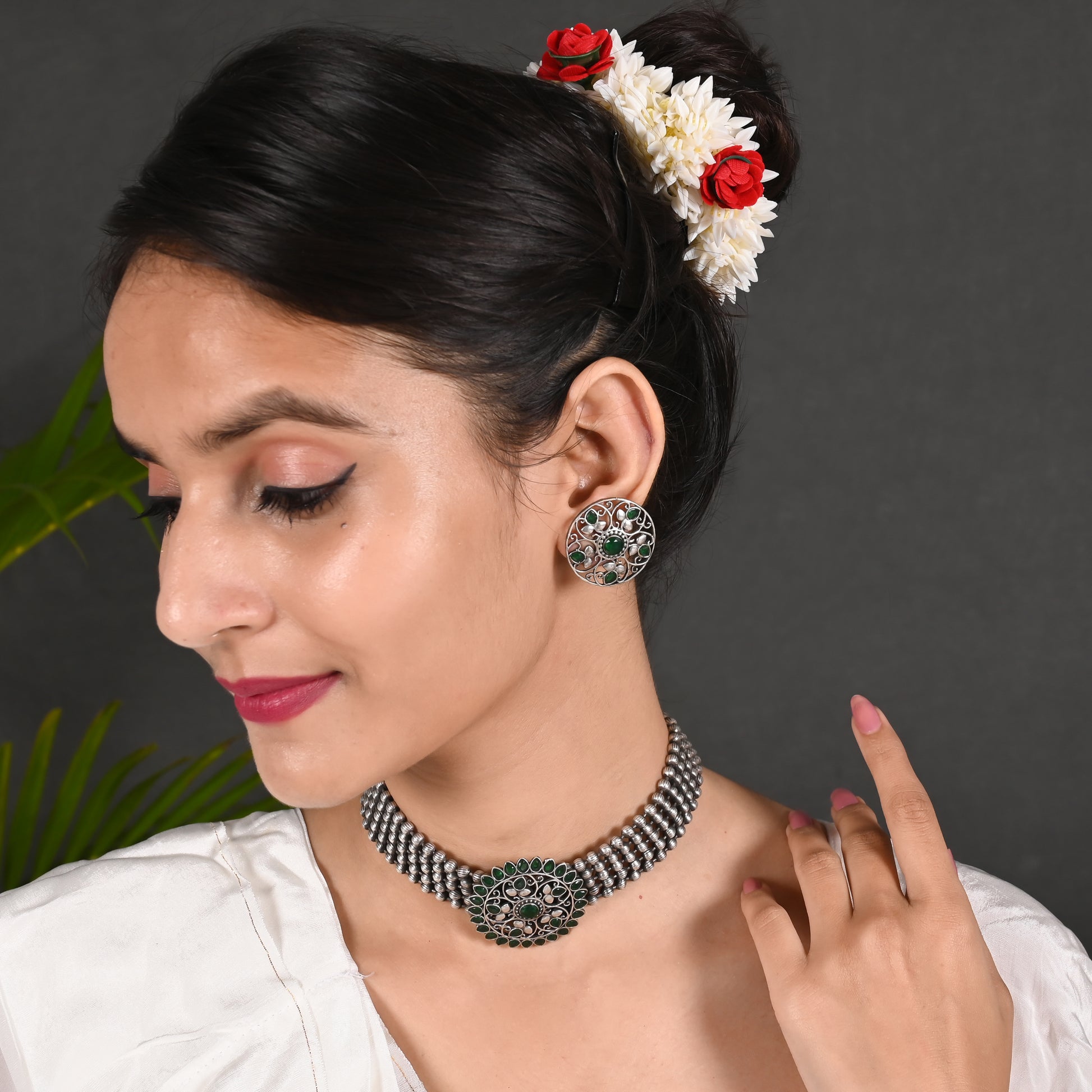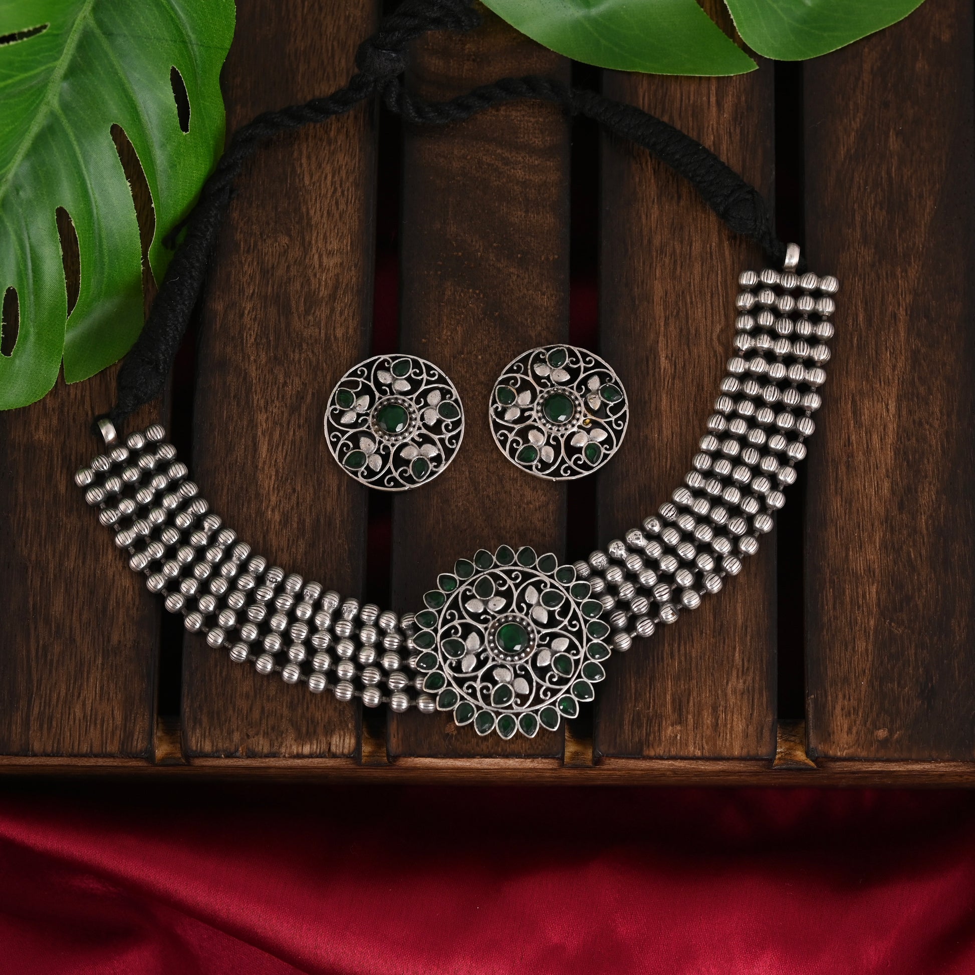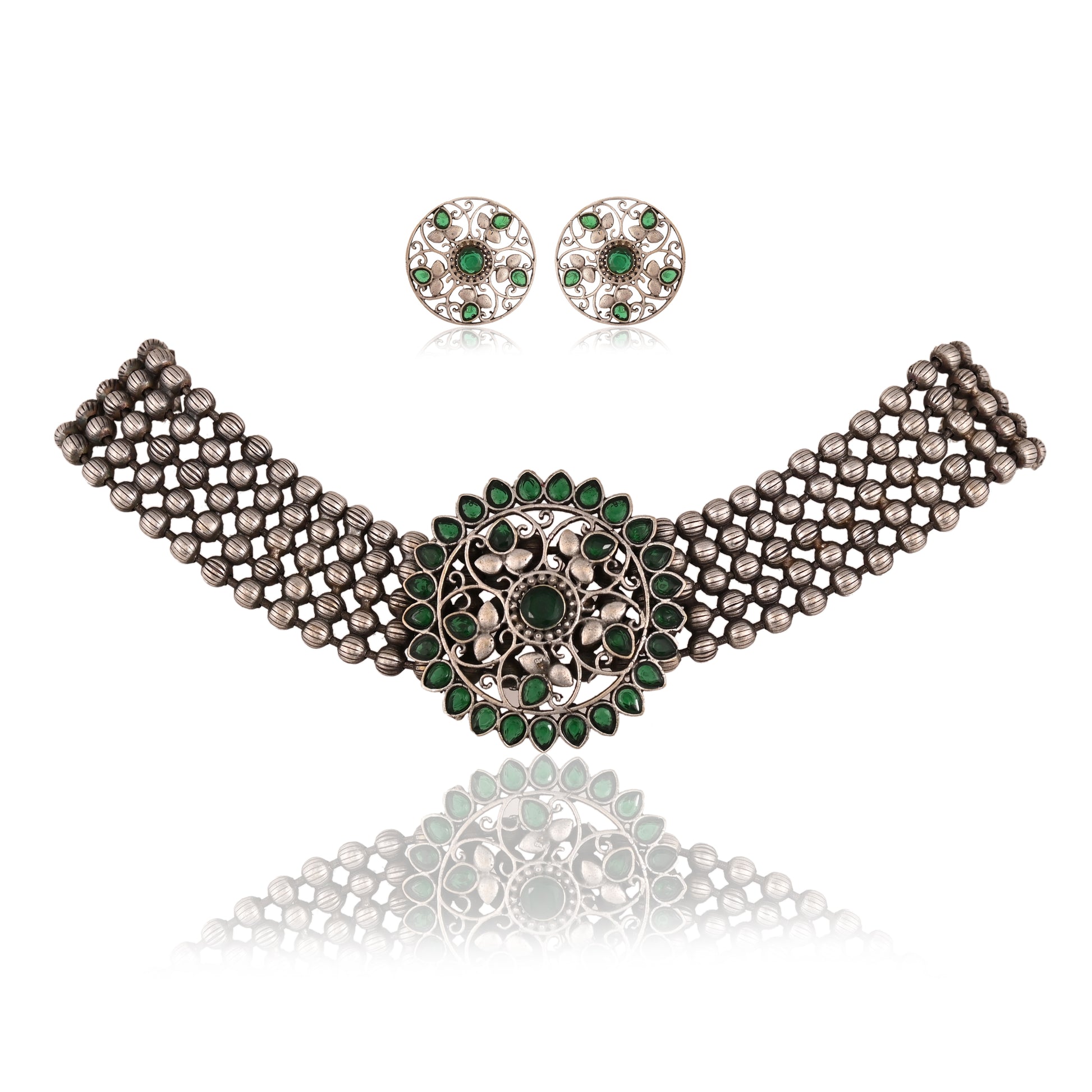 ETHNIC CHOKER NECKLACE Jewellery Set . Best When Paired With Indian Or Indo Western Attire . Dull Black Silver Polish Makes It More Beautiful And Antique. Whether You are Attending a Party or Hosting An Event , This Ethnic Jewellery Piece From TANUSHA JEWELS Is Something you Need To Take Your Look in Next Level .