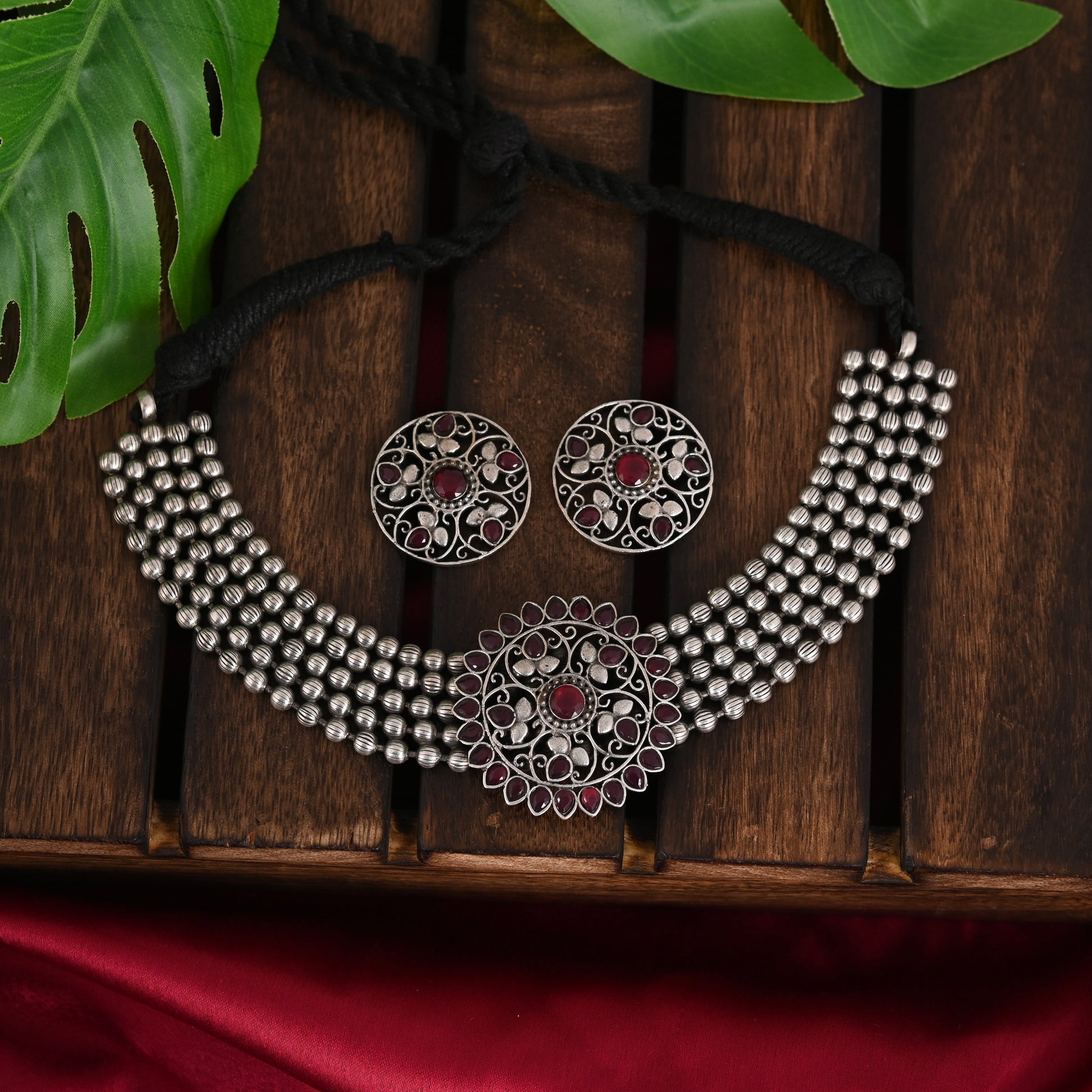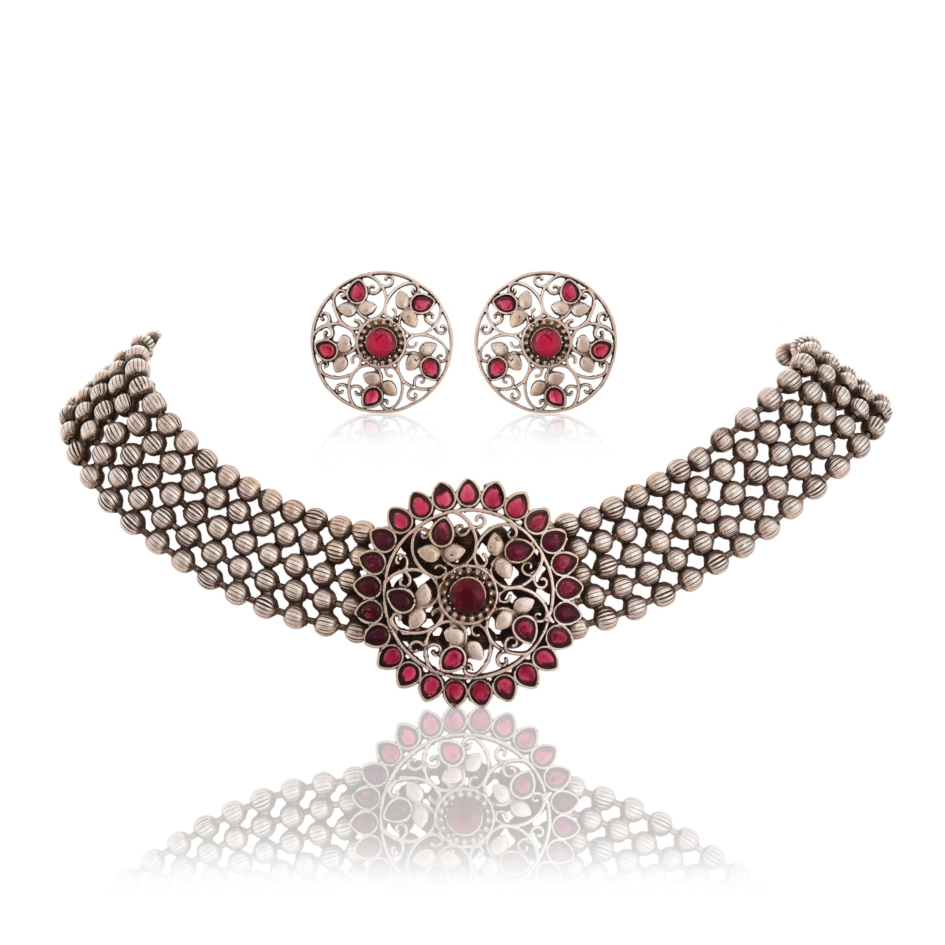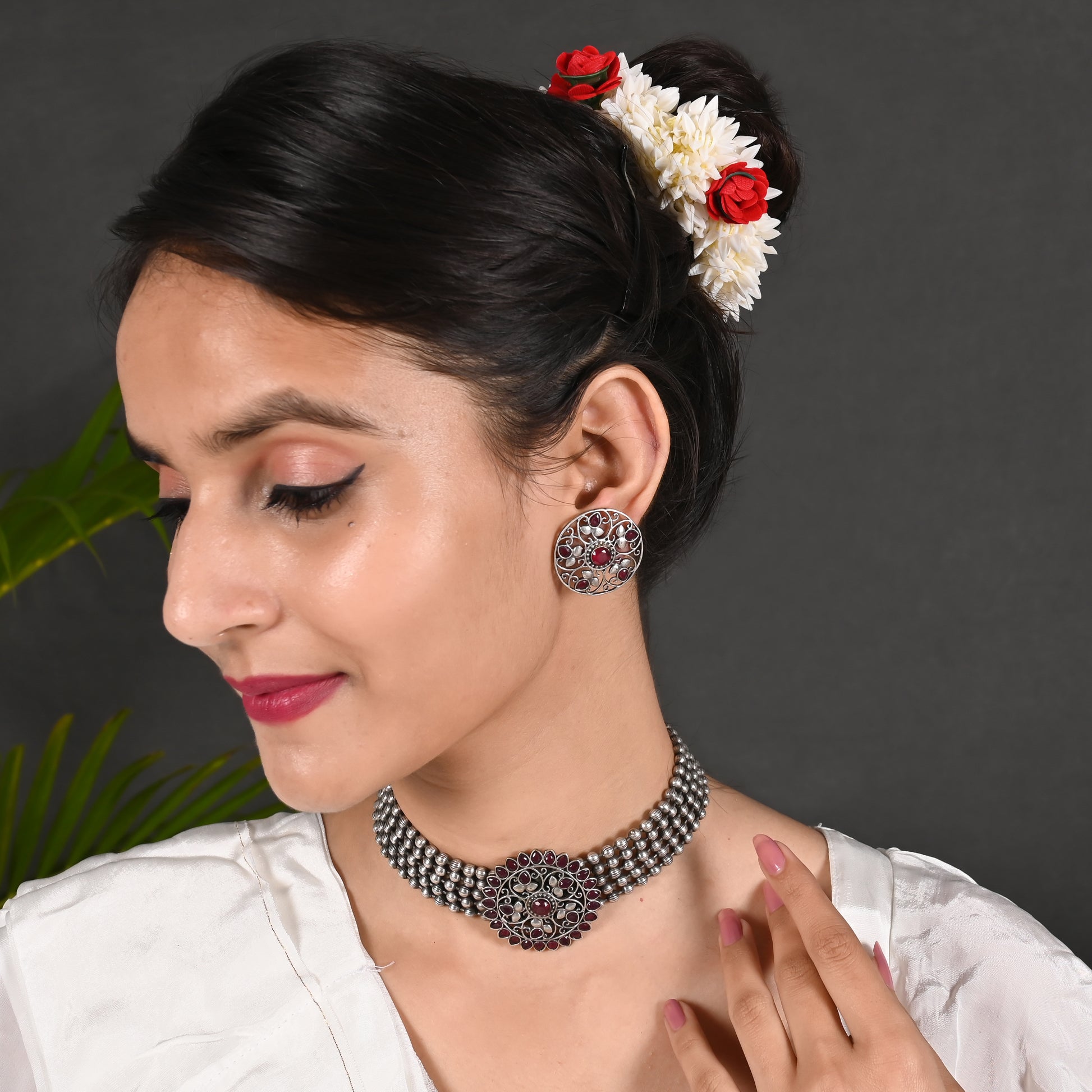 ETHNIC CHOKER NECKLACE Jewellery Set . Best When Paired With Indian Or Indo Western Attire . Dull Black Silver Polish Makes It More Beautiful And Antique. Whether You are Attending a Party or Hosting An Event , This Ethnic Jewellery Piece From TANUSHA JEWELS Is Something you Need To Take Your Look in Next Level .