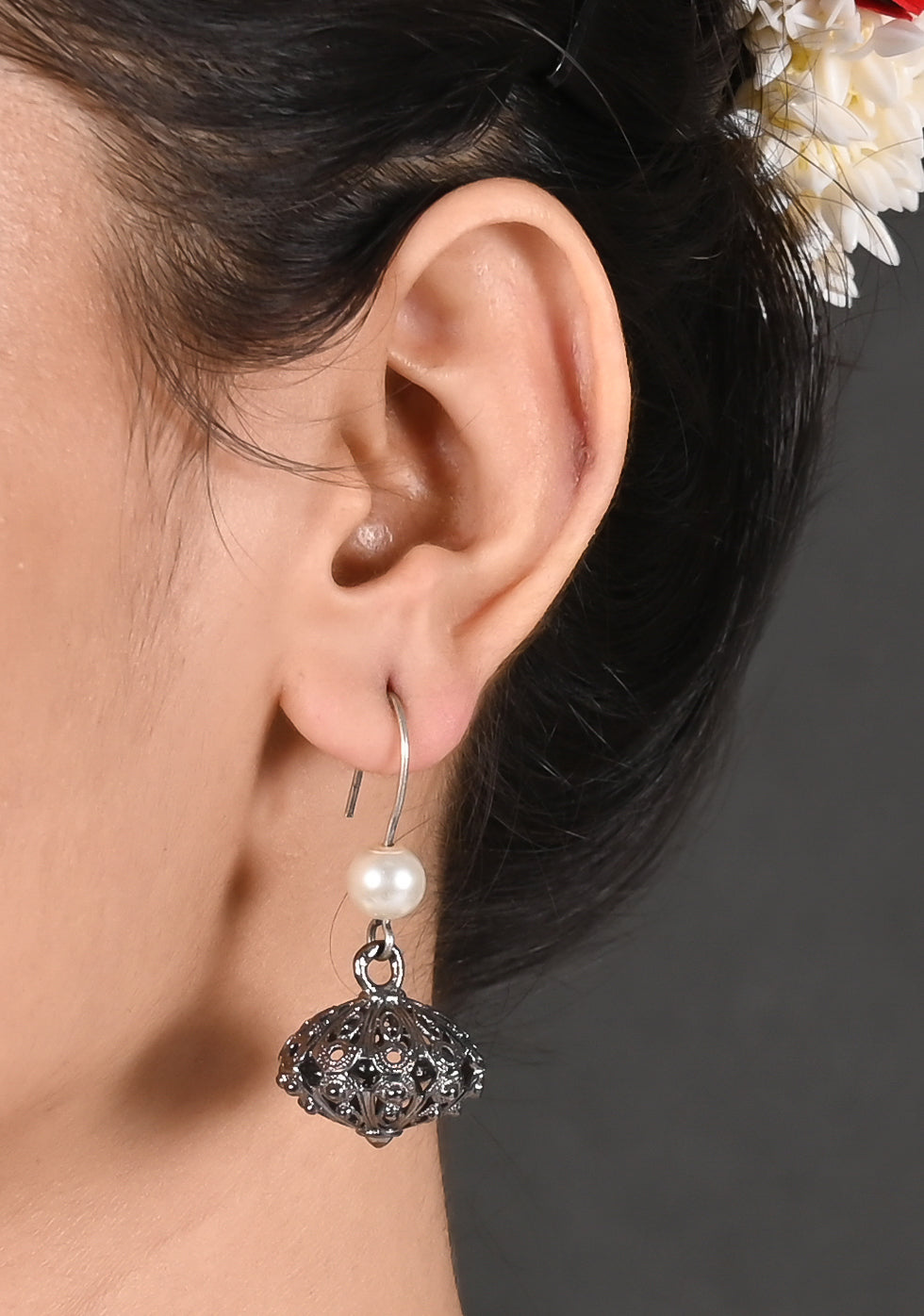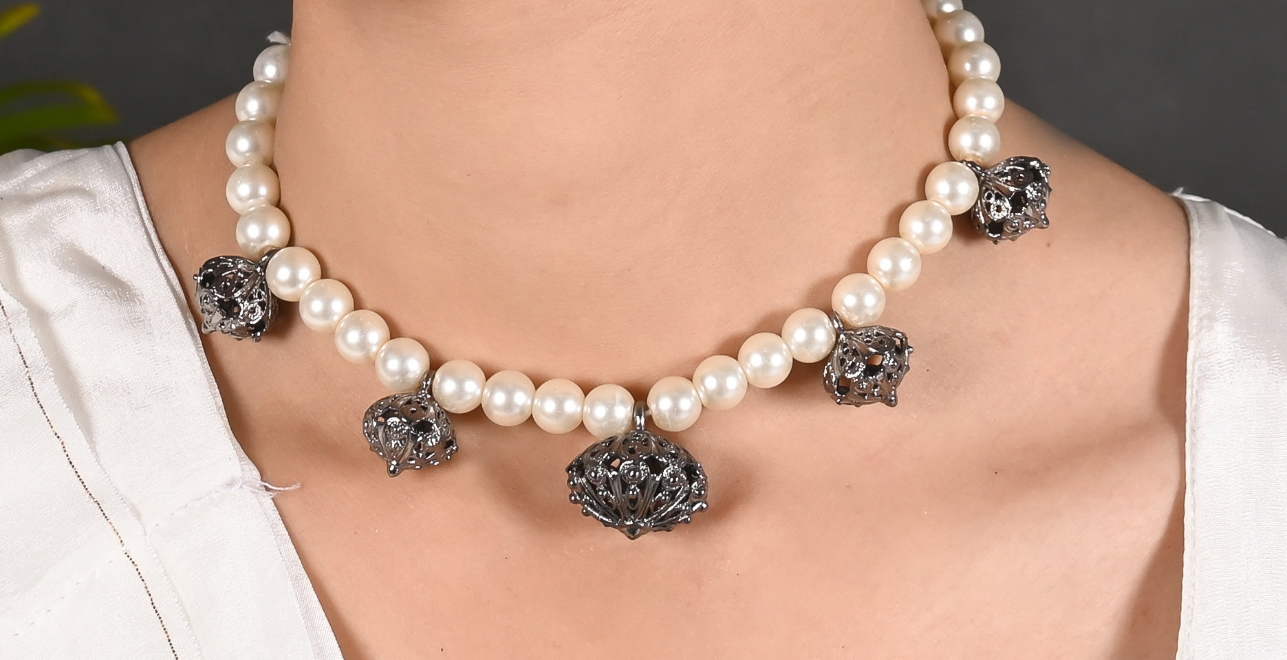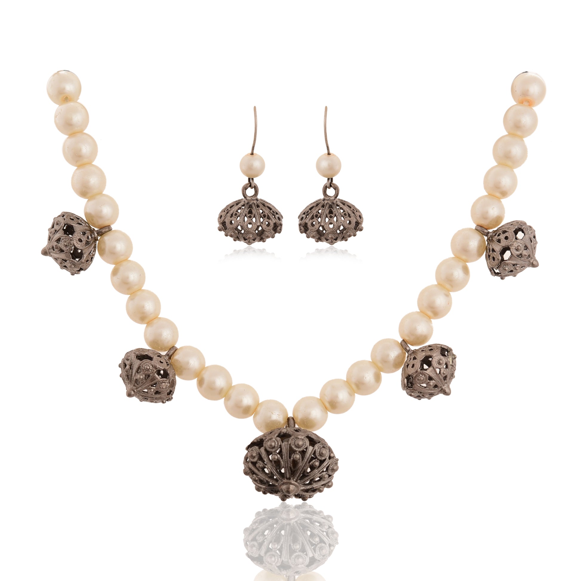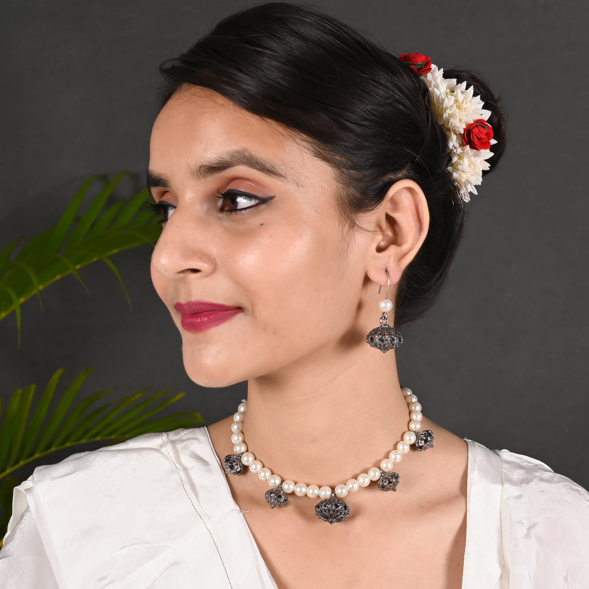 Tanusha Jewels Oxidised Pearl Beaded Necklace & Earing Set For Womens