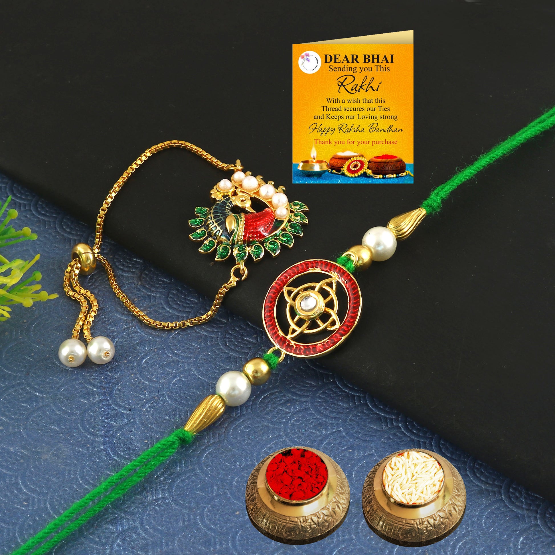 Celebrate this Raksha Bandhan with this Tanusha Jewels Rakhi set. Perfect for your Bhaiya and Bhabhi, the set includes 1 peacock Lumba Rakhi and 1 Thread Rakhi made with High Quality Assorted Materials and 1 roli chawal pack and a greeting card. Add this beautiful set to your festive decorations for a meaningful occasion.