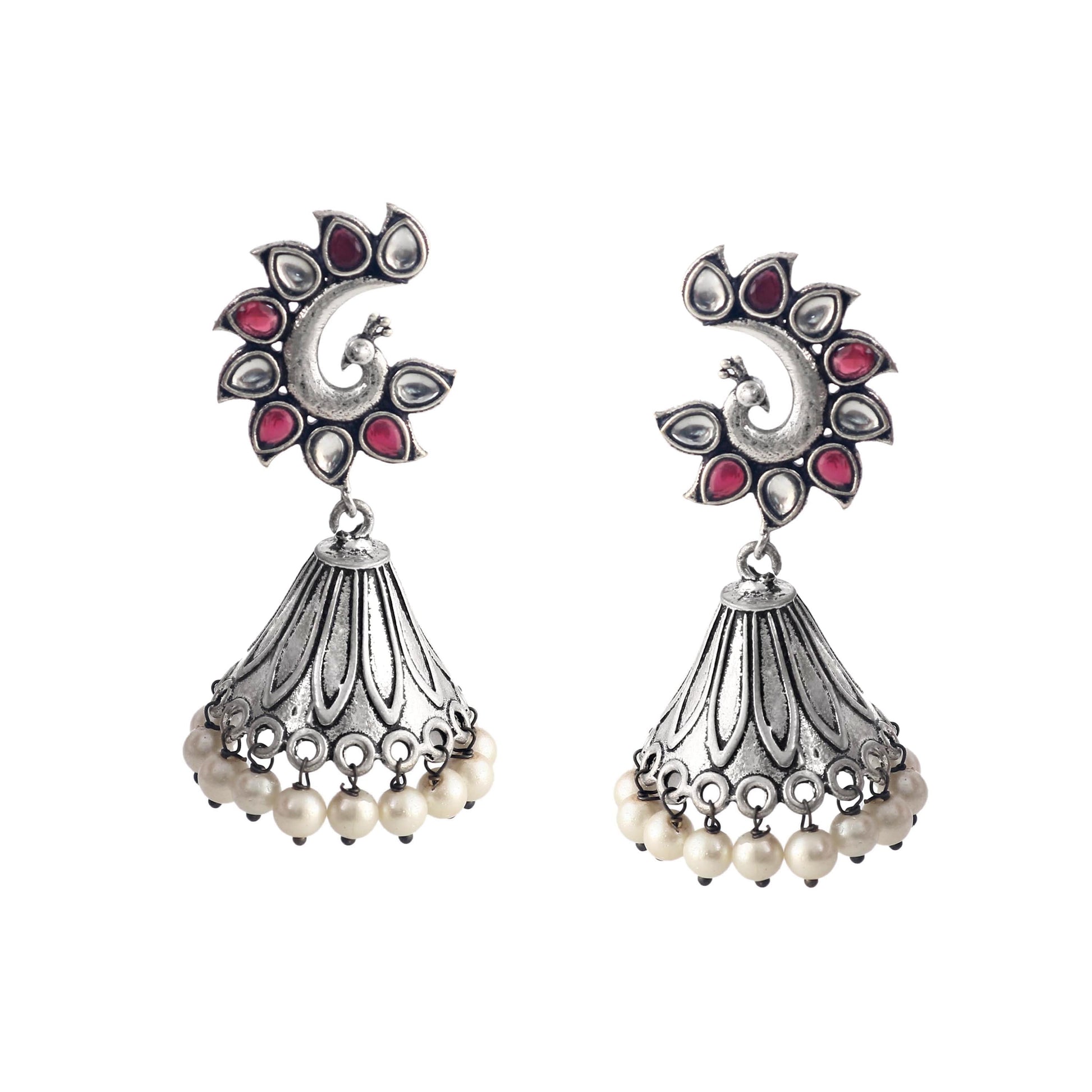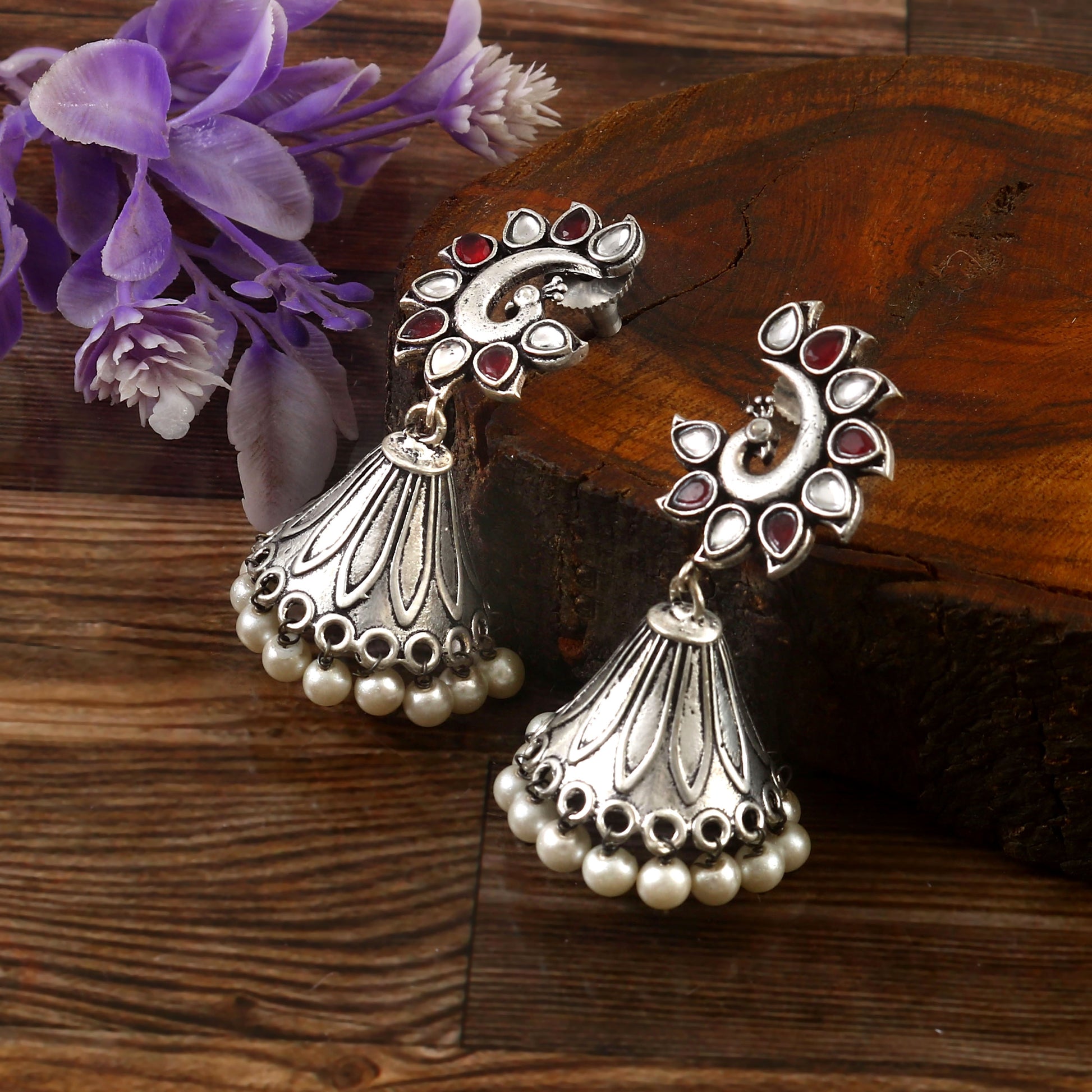 Elevate your fashion with the Tanusha Jewels Silver Oxidised Floral Jhumki. The intricate floral design and pearls add a touch of refinement. Made with brass, this jhumki exudes luxury and class. Elevate your entire wardrobe with this exquisite accessory and enhance your style.