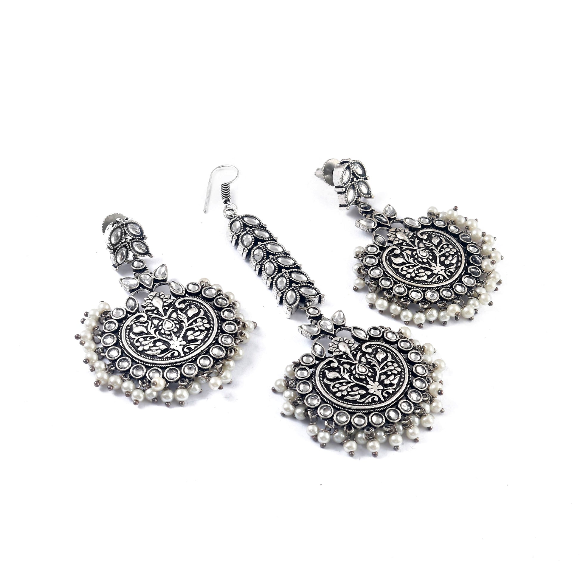 Tanusha Jewels Silver Oxidised Pearl Studed Earring & Maangtikka Set For Womens & Girls