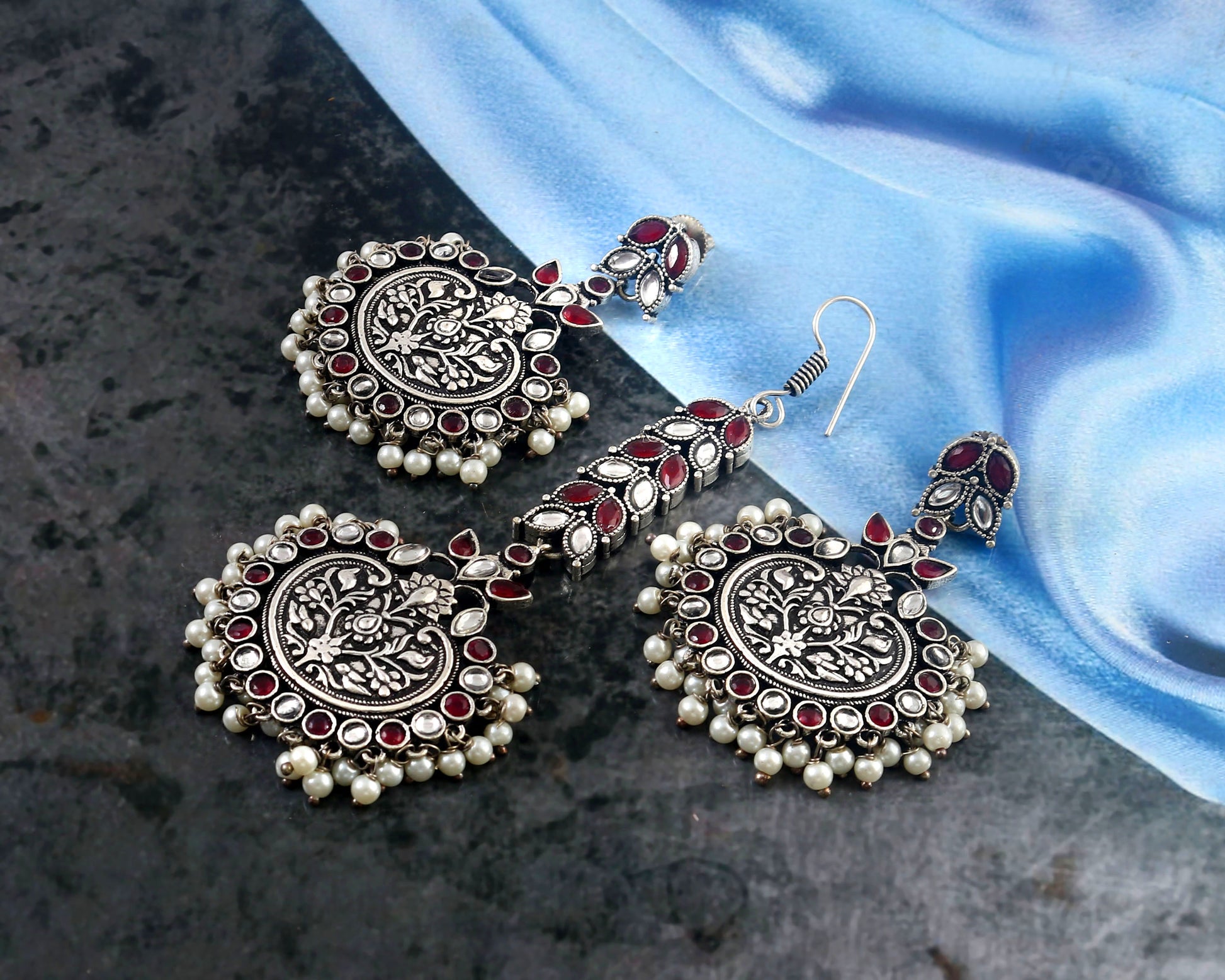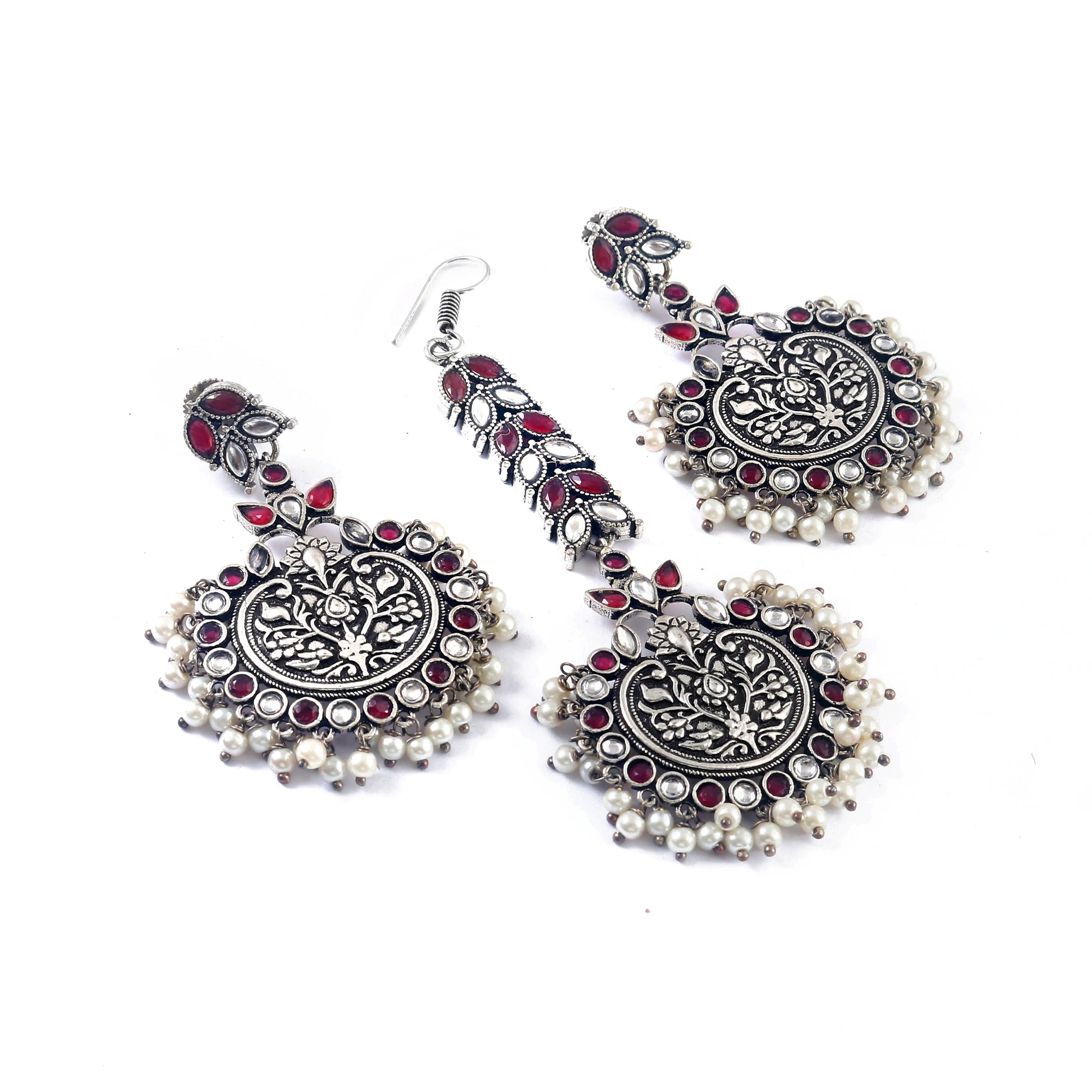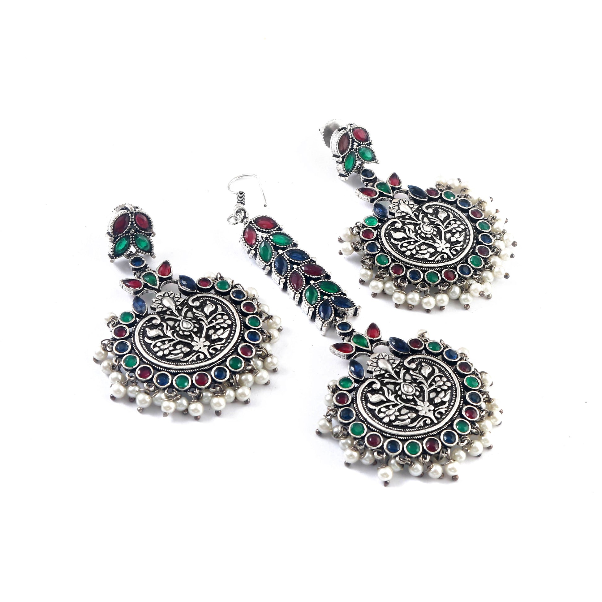 Add a touch of elegance to any outfit with our Tanusha Jewels Silver Oxidised Earring & Maangtikka Set. The stunning silver oxidised finishing and crystal & pearl studded design makes it a must-have accessory. With its skin-friendly and nickle-free materials, it's suitable for all-day wear. Available in 2 colours, it's the perfect gift for any occasion.
